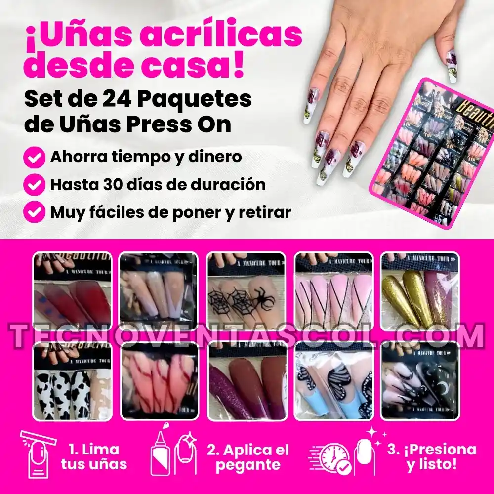 Con el set de uñas tipo acrilicas, recibirás una gran variedad de uñas con distintos motivos para toda ocasión, no tendrás que moverte a ningún lugar, ya que podrás utilizarlas desde la comodidad de tu casa.