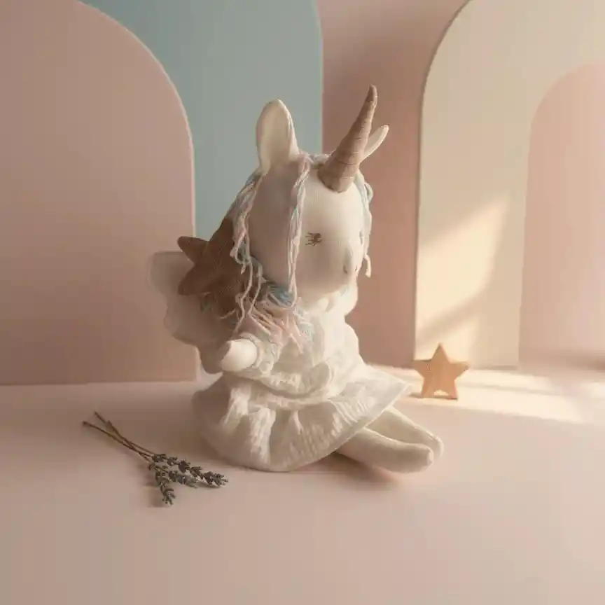Unicornio de tela artesanal para niñas soñadoras Este tierno unicornio de tela hecho a mano está diseñado para llenar de magia la habitación de tu pequeña. Con su vestido blanco de dos capas, crin en tonos pastel y suave cuerno brillante, es el peluche unicornio perfecto para regalo, juego y decoración infantil. Muñeca unicornio suave y delicada Cada unicornio es confeccionado de forma artesanal, con telas suaves al tacto y detalles cuidados como sus alas, su melena en hilos de colores y su carita bordada. Es ideal como muñeca de compañía para dormir, leer o jugar, y también como pieza protagonista en la decoración de una habitación temática de fantasía o estilo nórdico. Características principales Muñeca unicornio de tela, hecha a mano con acabado artesanal. Vestido blanco suave y ligero, ideal para ambientes delicados. Crin en tonos pastel y cuerno de unicornio que aportan un toque mágico. Perfecta para regalo de baby shower, cumpleaños o detalles especiales. Cada pieza es única: pueden existir ligeras variaciones por su elaboración artesanal. Un detalle mágico de Expresionarte.co Este unicornio de tela artesanal es más que un peluche: es un recuerdo que acompañará los juegos, las fotos y los momentos especiales de la infancia, aportando ternura y encanto a cualquier rincón.