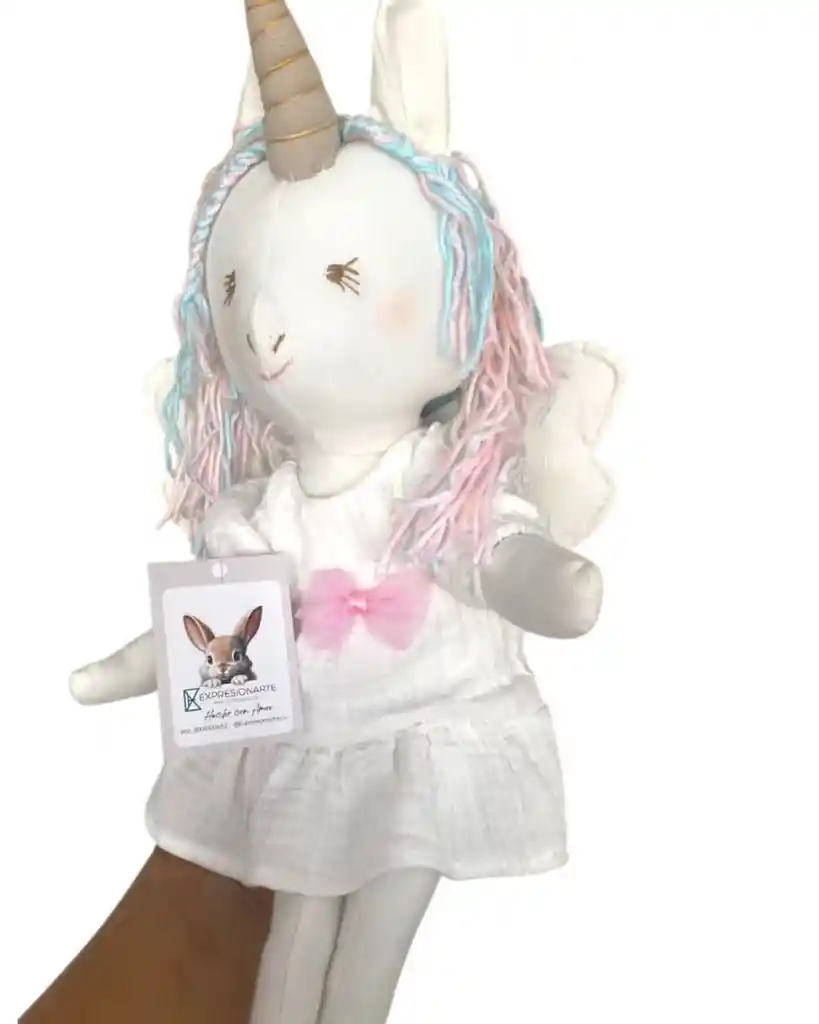 Unicornio artesanal de tela combina dulzura, fantasia y un diseño unico, ideal para regalar a beves, niñas y amantes de la magia. Confeccionado con algodon suave y relleno hipoalergenico, luce un vestido blaco de muselina con lazo rosa, melena de hilos en tonos pastel y un cuerno dorado que lo hace aun mas especial. Sus alas y acabados bordados aportan un toque magico y seguro para los mas pequeños. CARACTERISTICAS: - Hecho a mano con materiales de alta calidad. -Algodon suave + relleno hipoalergenico. -Altura aproximada: 30 cm - Vestido y accesorios removibles. - Perfecto para baby Showers, cumpleaños, decoracion infantil o como muñeco de compañia.