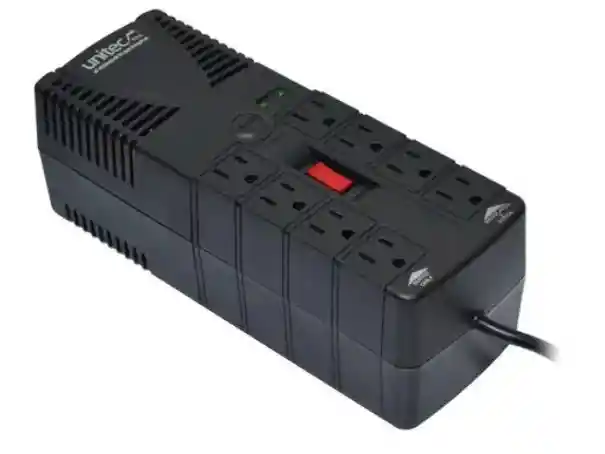 Regulador Unitec 1200 va Reales ideal para la protección de sobre cargas en equipos de alto consumo de energía tanto en hogar como en oficina, 8 tomas de protección de dispositivos periféricos ( 4 tomas reguladas y 4 tomas de protección de voltaje). regulador automático de altos y bajos voltajes.