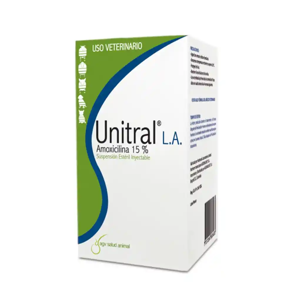 Composición Cada mL contiene: Amoxicilina (como Trihidrato de amoxicilina) …………….. 150 mg Indicaciones En bovinos, ovinos, porcinos, perros y gatos para el tratamiento de enfermedades causadas por bacterias tales como: Escherichia coli, Klebsiella pneumoniae, Proteus spp., Salmonella spp., Staphylococcus spp., Streptococcus spp., Corynobacterium spp. Dosis y administración: Unitral® L.A. debe administrarse por vía subcutánea o intramuscular. Se recomienda una dosis de 15 mg/kg de peso corporal cada 48 horas durante el tiempo que indique el Médico Veterinario. Masajear suavemente el sitio de la inyección. En la práctica el volumen de la dosis es equivalente a 1 mL por 10 kg de peso corporal. Si el volumen de la dosis excede los 20 mL, debe dividirse e inyectarse en 2 sitios diferentes. Al igual que con otras presentaciones inyectables, deben conservarse las precauciones asépticas corrientes.