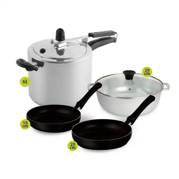 Set Universal Contiene 4 Unidades. Olla Presion 6L 1 Und + Sartenes 2 Und + Caldero 20 1 Und.