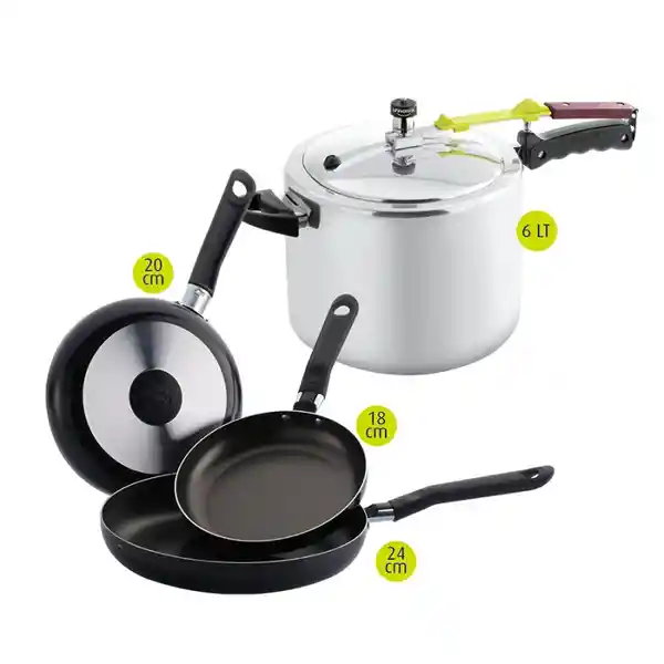 Set Olla Presion 1 Und + Sartenes en Aluminio 3 Und L22678. y Sartenes de Aluminio Antiadherente. La Olla a Presion Es de 6 Litros Cierre Interno. el Set de Sartenes Es Por 3 Las Medidas Son 18 cm -20Cm-24 cm. La Olla Tiene Garantia de 10 Años. Los Sartenes de Un Año. el Espesor de la Olla Es de 2 mm. y el de Los Sartenes 1.4 mm.