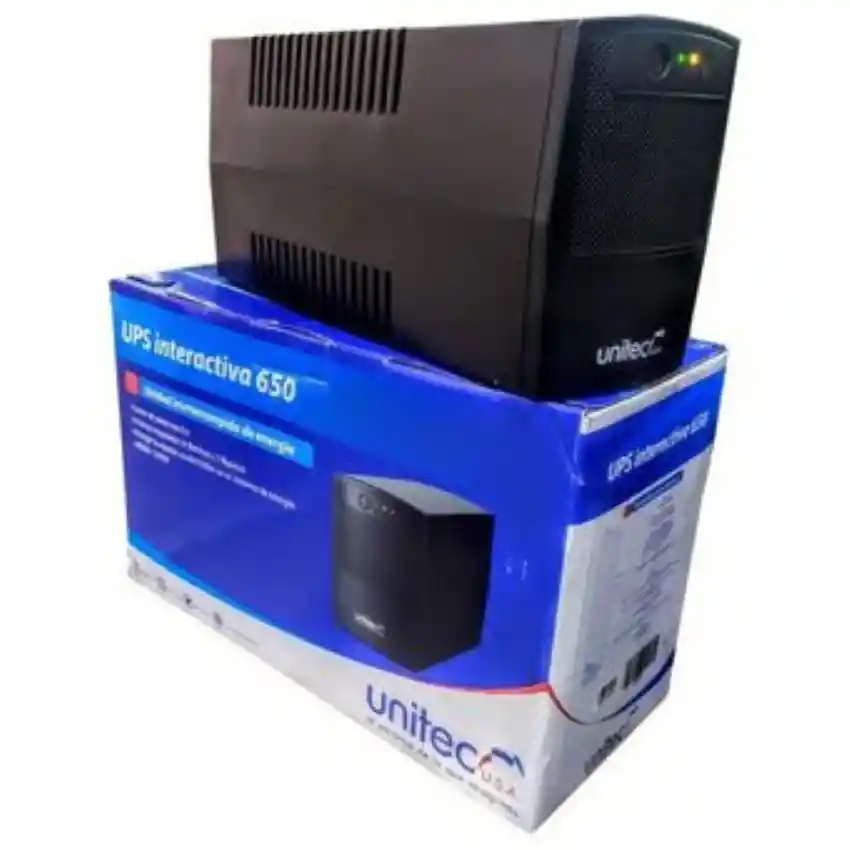 Descripción: - UPS Interactiva Unitec UN-I650 Nueva Presentación - Diseño interactivo, ahorradora de energía - Cuenta con auto reinicio cuando regresa la energía - Protege su equipo de alti-bajos de energía y contra cortos circuitos - Microprocesador con 2 etapas de impulso y 1 etapa de impulso regulada para estabilizar el ingreso de la anergia - Cantidad de tomas: 6 tomas de UPS / 4 tomas reguladas ( negras ) / 2 tomas protegidas (blancas) - Duración de batería: 8 - 12 minutos máximo - Color: Negro - Tamaño del cable: 90 cms - Protege tu equipo contra un apagón de energía - Potencia: 0.6 A - Watts reales: 240 W - Soporta 2 equipos de computo completos conectados, impresoras ( NO LASER ) CARACTERÍSTICAS: - Fase: Monofásico ENTRADA AC: - Voltaje: 110 Voltios, 115, 120 - Rango: -30%, +25% - Frecuencia: 50h – 60 Hertz SALIDA AC: - Voltaje: 110 Voltios, 115, 120VAC - Regulador de Voltaje: (+/- 10%) - Frecuencia: 50-60 Hz - Regulador de Frecuencia: (+/- 1Hz) - Forma de Onda: Modificado desde la onda - Tiempo de Transferencia: Menos de 10 ms - Potencia Aparente Nominal: 400 VA - Potencia Activa Nominal de Salida: 240 W - Corriente Nominal de Salida: 3,5 Am BATERÍA: Tipo de Batería: 12 Volts / 7 Ah * 1 PC Tiempo de Duración: 12 – 15 minutos Tiempo de Recarga: 8 Horas hasta el 90% después de la carga total.