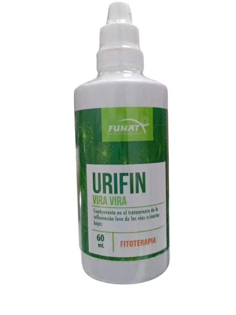 rifín Vira Vira de Funat es un producto de fitoterapia que se utiliza tradicionalmente en la medicina natural. Este suplemento viene en una presentación líquida de 60 ml y está formulado a base de extractos de hierbas seleccionadas. Urifín Vira Vira ha sido utilizado por muchas personas como un apoyo para el bienestar urinario. Cada mL de solución oral contiene: Vira vira (Achyrocline bogotensis), partes aéreas 200 mg. Es un coadyuvante en el tratamiento de la inflamación leve de las vías urinarias bajas. Dosis recomendada: 30 gotas 3 veces al día.