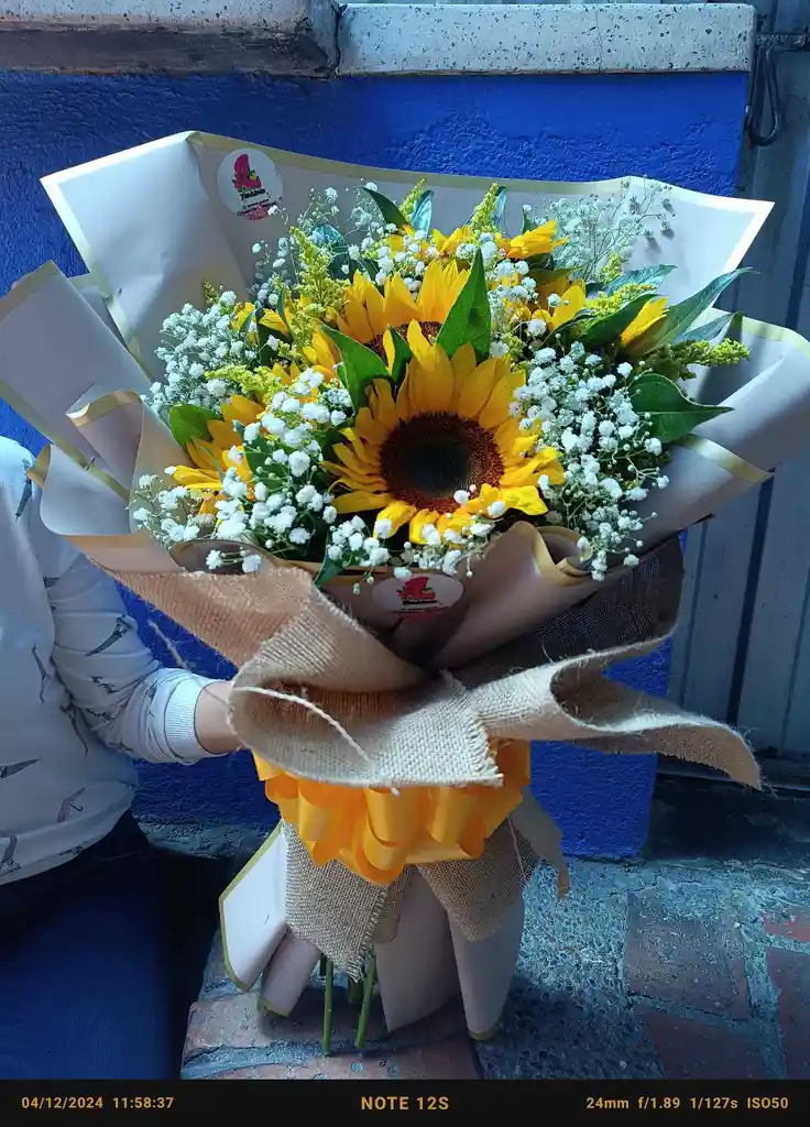 BUQUET EN GIRASOLES TIPO REINA DECORADO CON PAPEL ESPECIAL Y YUTE