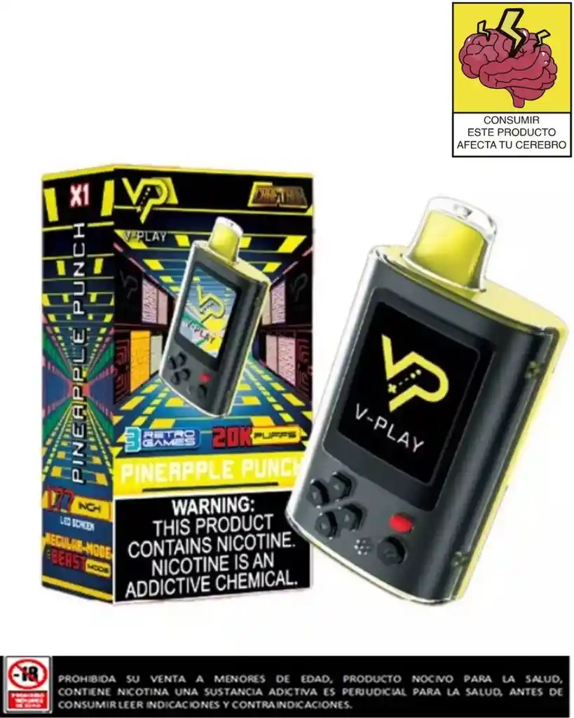 🚀 V-Play Pineapple Punch El único vape con juegos retro incorporados 🎮 + sabor explosivo a piña 🍍✨ Y lo mejor 👉 llévate GRATIS un vape de 3K puffs con tu compra 💨🔥 ¡Pide ya en Rappi y juega mientras vapeas!