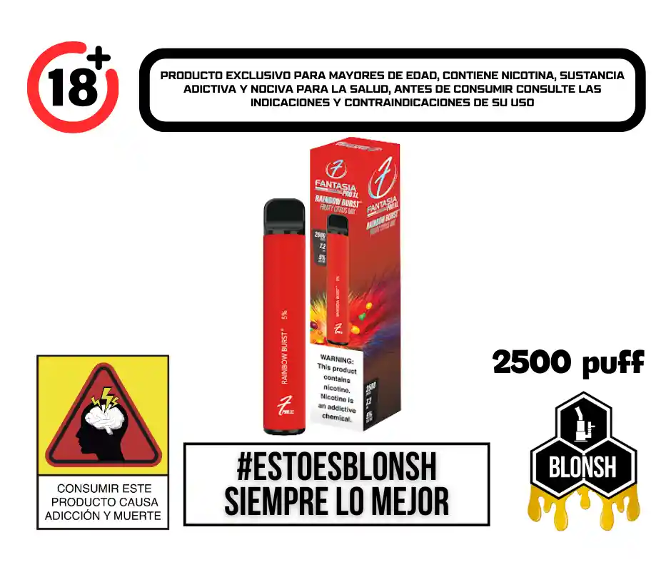 Explota el sabor con Rainbow Burst! 🌈 Déjate llevar por una experiencia mágica con cada calada. Con 2500 puffs llenos de color, sabor y estilo, el Rainbow Burst es tu pasaporte a un mundo de fantasía. ✨ Suave. Dulce. Inolvidable. 🍭 Siente el arcoíris en cada respiro.