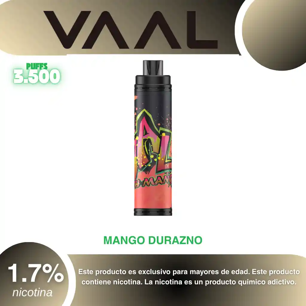 Vaal Max 3.500 Puffs, Sabor Mango Durazno PROHIBIDA LA VENTA A MENORES DE EDAD. ADVERTENCIA: ESTE PRODUCTO CONTIENE NICOTINA, LA NICOTINA ES UNA SUSTANCIA QUIMICA ADICTIVA Y NOCIVA PARA LA SALUD. Los líquidos para vapeo contienen: propilenglicol USP, glicerina USP, sabor artificial y nicotina. Este producto puede contener nicotina, una sustancia altamente adictiva que puede generar dependencia, posibles afectaciones arteriales, cardiacas, pulmonares y otras aun no identificadas. No se recomienda su uso a mujeres en embarazo, puede generar lesiones al feto. Mantener alejado de niños y mascotas. No ingerir, puede generar irritación y/o intoxicación. Por favor antes de consumir consulte a su médico posibles afectaciones o sensibilidad a alguno de sus componentes. Los componentes de este producto pueden aumentar la sensación de ansiedad En caso de notar alguna reacción adversa por favor suspenda su uso de manera inmediata. Siga las instrucciones en el envase. No alterar sus componentes. Adquiera sus productos en sitios de confianza No use productos piratas, alterados, o en los cuales no pueda comprobar su buena procedencia, Verifique la reputación del fabricante y distribuidor antes de adquirir cualquier producto Si no es usuario fumador o vapeador no se recomienda su uso bajo ninguna circunstancia Al usar este producto usted es consciente que este producto puede generar afectaciones a su salud, incluyendo aquellas que a la fecha de la compra no se han identificado y que pueden aparecer a largo plazo.