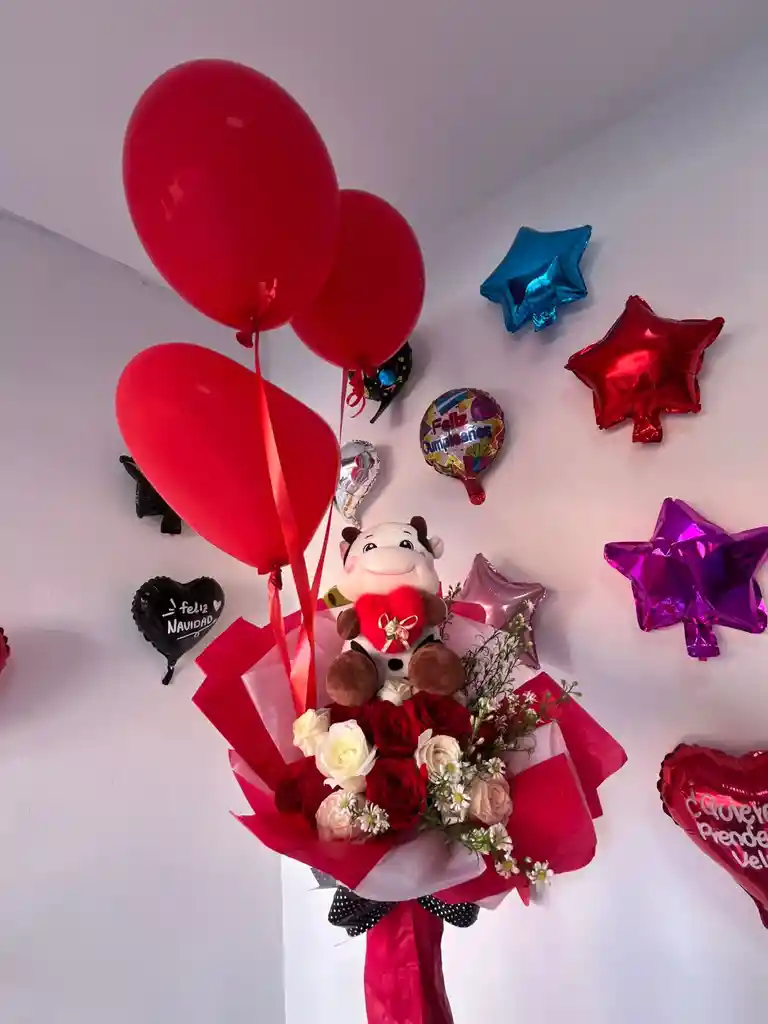 Ramo de rosas rojas y blancas x12, peluche de vaca, decoración en bouquet, globos con helio x3, mensaje personalizado