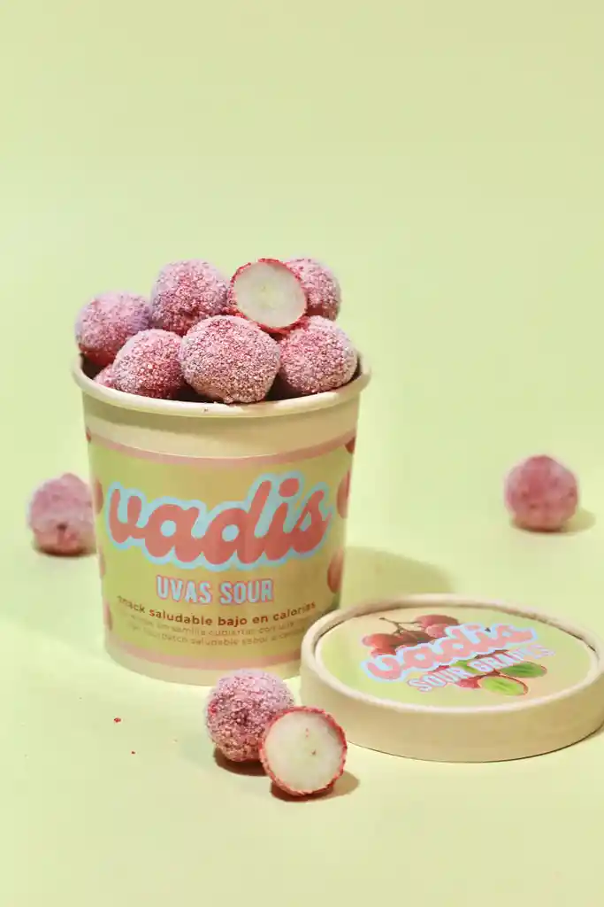 Uvas verdes importadas sin semilla, congeladas, con una cobertura tipo sourpatch: dulce + ácida en sabor de cereza.