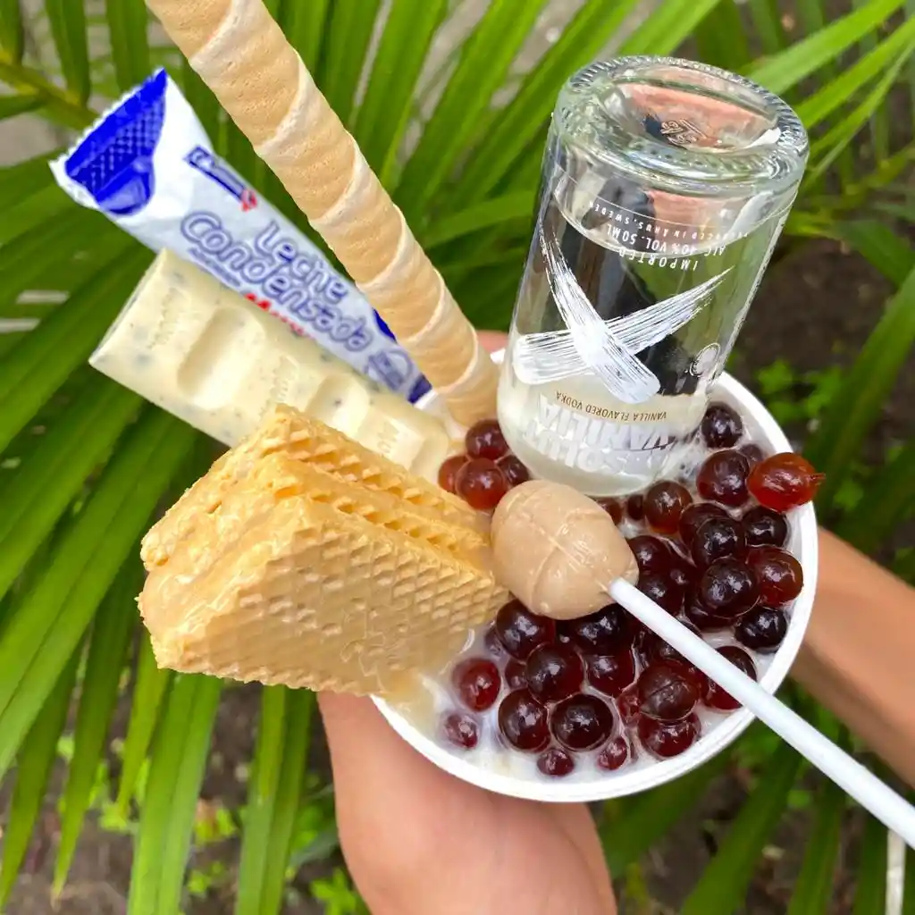 Granizado A Base De Vodka Con Sabor A Vainilla, Acompañado De Toppings (Dulces Y Burbujas). . .