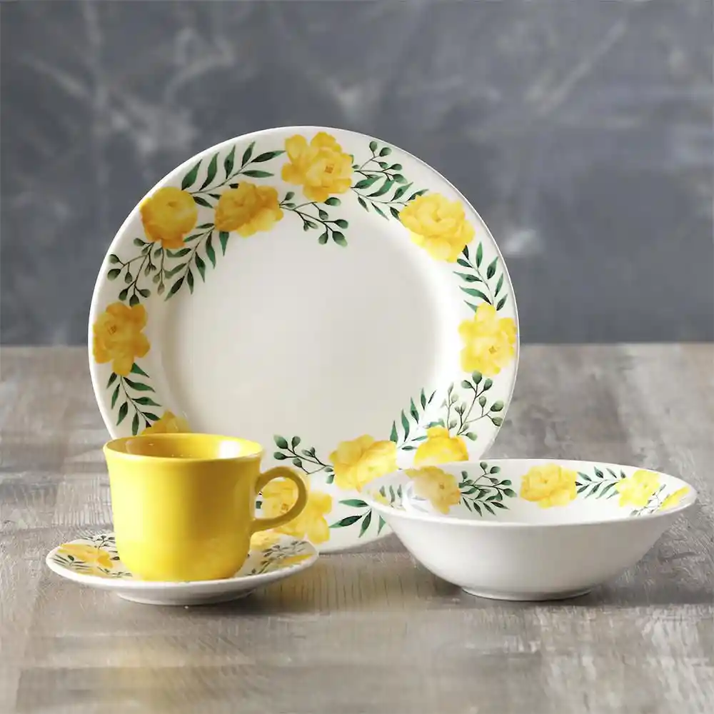 Materiales.. Loza-Cerámica.Numero de puestos.. 4Piezas.. 16.Temperatura de uso.. No exceder los 75°C de temperatura.Incluye..4 Platos Pandos 24 Cm, 4 Plato Té 14Cm, 4 Patos Hondo 18 Cm 4 Pocillo Té 230 CC.