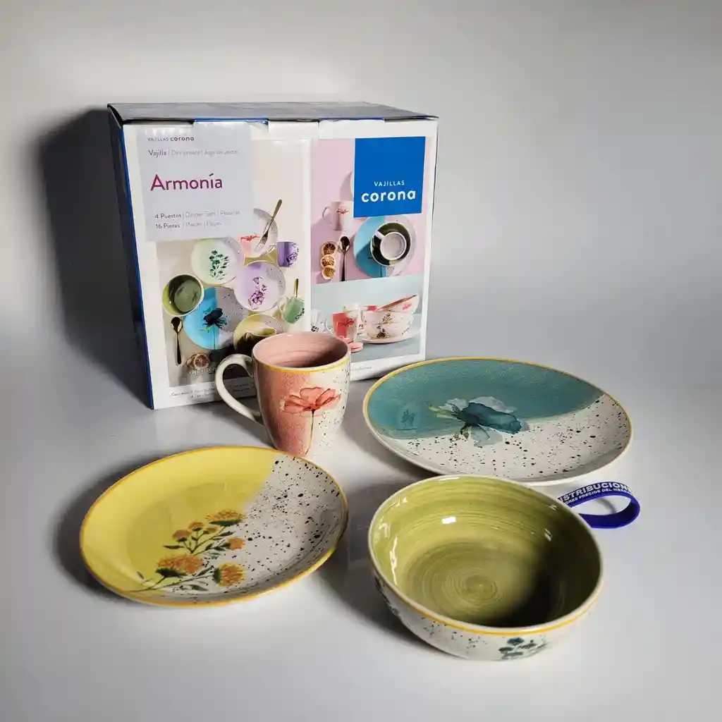 4 puestos 16 Piezas Colores variados 4 Platos Hondos 4 Platos Pandos 4 Platos de postre 4 Vasos Mugs