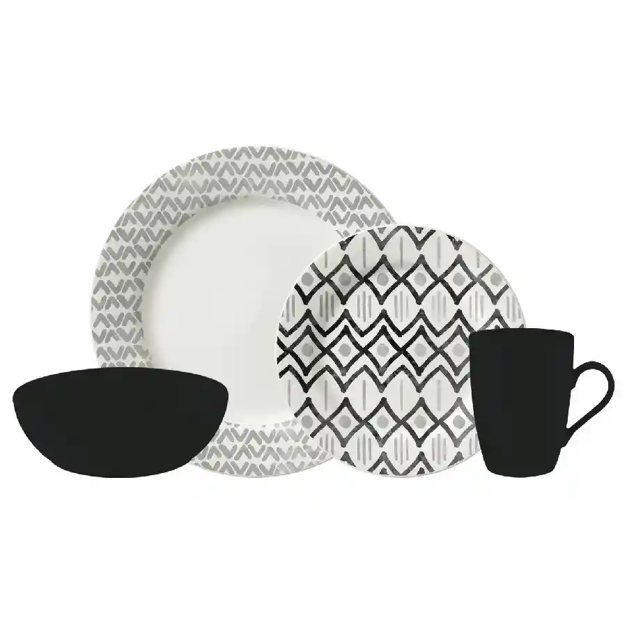 Vajilla Dinka 4 puestos/16 Piezas Corona -Material: Loza-Cerámica -Color: Blanco-Negro -Número de Puestos: 4 -Número de piezas: 16 -Componentes y dimensiones: >4 Plato Pando: 26.3 Cm. >4 Plato Hondo Caz: 730 Cc. >4 Plato Tortero: 20.7 Cm. >4 Pocillo Mug: 295 Cc. Respaldo de marca. Empresa Colombiana con más de 135 años de experiencia. “Nuestros platos en loza pueden presentar huellas en la parte de abajo, esto hace parte del proceso de fabricación de las piezas debido a que es el soporte de las mismas en dicho proceso, esto no es un problema de calidad, ni afecta la salud de las personas, ni el funcionamiento y durabilidad de la pieza” -Recomendaciones de uso: -Apto para microondas en exposición no mayor a 3 minuto -Apto para Lavavajilla. -Aprobado para el uso con alimentos. Cumple con la norma de plomo y cadmio. -Resistencia al agrietamiento o cuarteado del esmalte a cualquier cantidad de ciclos de lavado -Resistencia de la decoración a los detergentes (no lavar con productos abrasivos). Excluyendo las decoraciones de lustre (elementos metalizados normalmente presente en el borde de la piezas -No someter el producto a cambios de temperatura extremos.