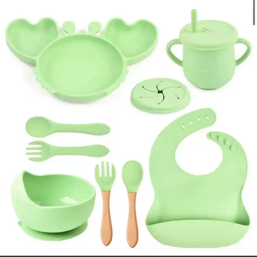 El plato ideal para promover la independencia de tu hij@ a la hora de comer. Libre de BPA. Con una chupa súper resistente para evitar derrames. Incluye: Platón con divisiones. Tazón con succión. Tenedor con mango de madera. Cuchara con mango de madera. Tenedor en silicona primera etapa. Cuchara en silicona primera etapa. Babero con bolsillo. Vaso. Tapa con pitillo. Tapa para snacks.