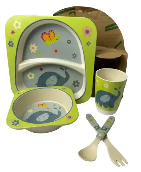 Convierte la hora de comer en un momento divertido, seguro y responsable con la Vajilla Infantil de Bambú. Este set de 5 piezas está fabricado con fibras de bambú biodegradables y materiales libres de BPA, ofreciendo una alternativa ecológica y confiable frente a la vajilla plástica tradicional. Su diseño con ilustraciones de animales estimula el apetito y la autonomía de los niños, mientras que su resistencia y ligereza la hacen ideal para el uso diario. 🔹 Características Material ecológico: fibras de bambú + almidón de maíz, libres de BPA y tóxicos. Incluye 5 piezas: plato compartimentado, bowl, vaso, cuchara y tenedor. Plato con divisiones para separar alimentos. Ilustraciones llamativas y coloridas para motivar a los niños. Superficie suave, ligera y resistente a caídas. Fácil de limpiar, apta para lavavajillas (rejilla superior). Presentación en caja de cartón reciclable. 🔹 Beneficios Salud y seguridad: fabricada con materiales aptos para uso alimentario. Ecológica: alternativa sostenible y biodegradable. Práctica: piezas adaptadas al tamaño de bebés y niños pequeños. Educativa: fomenta la alimentación independiente desde temprana edad. Atractiva: convierte la comida en una experiencia divertida con diseños de animales. 🔹 Dimensiones aproximadas Plato: 21 × 21 cm. Bowl: 13 × 13 cm. Vaso: 9 cm de alto × 7 cm de diámetro. Cuchara y tenedor: 13 – 14 cm de largo. 🔹 Modo de uso Lava todas las piezas antes del primer uso. Usa el plato compartimentado para separar alimentos. Sirve sopas, cereales o purés en el bowl y líquidos en el vaso. Permite que el niño utilice la cuchara y el tenedor adaptados a su tamaño. Lava tras cada uso y guarda en un lugar seco. Evita usar en microondas o exponer a temperaturas muy altas.