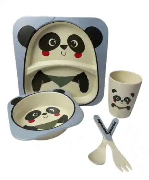 Convierte la hora de comer en un momento divertido, seguro y responsable con la Vajilla Infantil de Bambú. Este set de 5 piezas está fabricado con fibras de bambú biodegradables y materiales libres de BPA, ofreciendo una alternativa ecológica y confiable frente a la vajilla plástica tradicional. Su diseño con ilustraciones de animales estimula el apetito y la autonomía de los niños, mientras que su resistencia y ligereza la hacen ideal para el uso diario. 🔹 Características Material ecológico: fibras de bambú + almidón de maíz, libres de BPA y tóxicos. Incluye 5 piezas: plato compartimentado, bowl, vaso, cuchara y tenedor. Plato con divisiones para separar alimentos. Ilustraciones llamativas y coloridas para motivar a los niños. Superficie suave, ligera y resistente a caídas. Fácil de limpiar, apta para lavavajillas (rejilla superior). Presentación en caja de cartón reciclable. 🔹 Beneficios Salud y seguridad: fabricada con materiales aptos para uso alimentario. Ecológica: alternativa sostenible y biodegradable. Práctica: piezas adaptadas al tamaño de bebés y niños pequeños. Educativa: fomenta la alimentación independiente desde temprana edad. Atractiva: convierte la comida en una experiencia divertida con diseños de animales. 🔹 Dimensiones aproximadas Plato: 21 × 21 cm. Bowl: 13 × 13 cm. Vaso: 9 cm de alto × 7 cm de diámetro. Cuchara y tenedor: 13 – 14 cm de largo. 🔹 Modo de uso Lava todas las piezas antes del primer uso. Usa el plato compartimentado para separar alimentos. Sirve sopas, cereales o purés en el bowl y líquidos en el vaso. Permite que el niño utilice la cuchara y el tenedor adaptados a su tamaño. Lava tras cada uso y guarda en un lugar seco. Evita usar en microondas o exponer a temperaturas muy altas.
