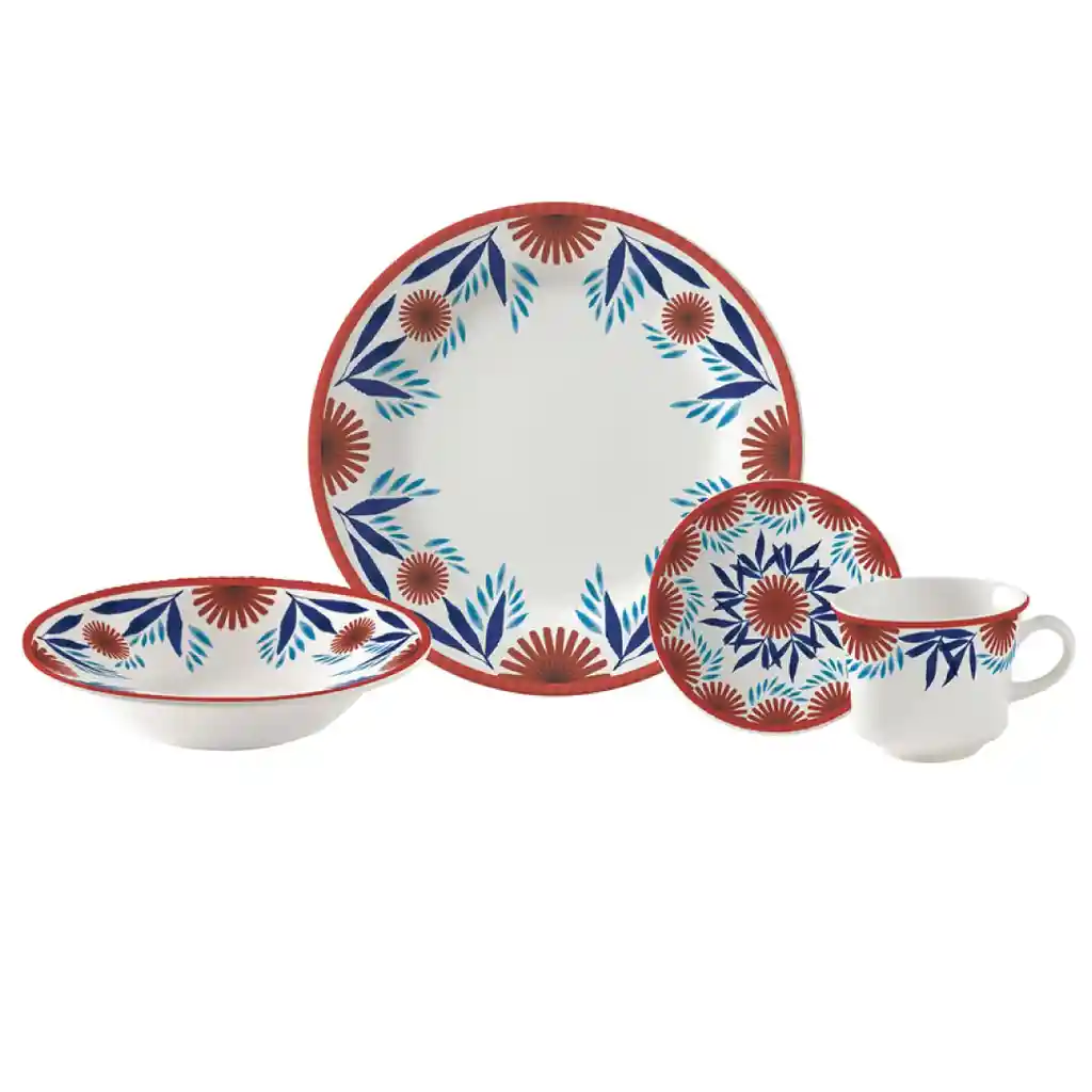 La vajilla Kaira Contiene 4 puestos 16 piezas, está inspirada en colores coral y azul compuesta por 4 platos pandos, 4 platos hondos, 4 pocillos y 4 platos té. Apta para microondas y lava vajillas. Producto 100% Colombiano. No es perjudicial para la salud (cumple con las normas de plomo y cadmio)