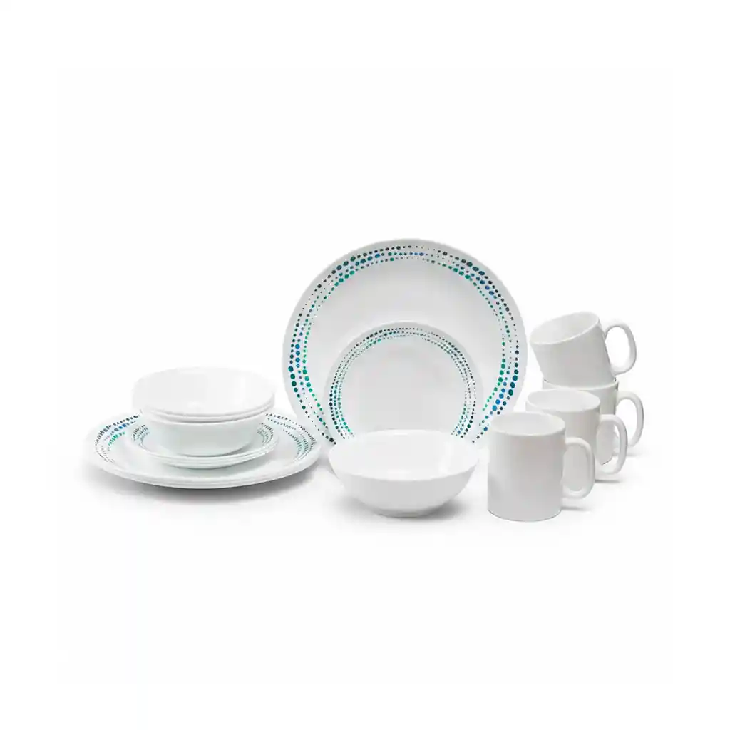 Juego de 16 piezas que incluye: 4 Platos de cena 10,25 cm, 4 Platos de aperitivos 6,75cm, 4 Tazones de sopa 6,25cm, 4 Pocillos 240ml . Set de 16 piezas con servicio para 4 personas, ideal para equipar su comedor con un estilo moderno y sofisticado. Platos y cuencos de vidrio de triple capa, únicos en su clase, resisten muy bien las astillas y las grietas, que garantiza máxima durabilidad.. Ultra resistente a golpes, desportilladuras y rayaduras, manteniendo su apariencia nueva por muchísimos años. Diseño Ocean Blues con patrones circulares en tonos azules que aportan frescura y tranquilidad a su mesa diaria. Vajilla excepcionalmente ligera y delgada, facilitando su manejo y transporte de la cocina al comedor. Apta para horno microondas y horno convencional precalentado, ofreciendo una versatilidad superior. Compatible con lavavajillas, lo que permite una limpieza rápida y sin esfuerzo después de cada comida familiar. Material no poroso y 100% higiénico que no absorbe manchas, olores ni sabores, garantizando salud en su mesa. Resistente a la decoloración: los patrones y diseños no se borran ni se desgastan con el uso diario o los lavados. Ideal para el uso cotidiano intenso debido a su ligereza o para ocasiones especiales por su diseño distinguido. Se entrega en un empaque protegido para asegurar que las piezas lleguen en perfectas condiciones hasta la puerta de tu hogar. Estos productos han sido ambientados, los accesorios adicionales no están incluidos y su color puede variar por la luz. .