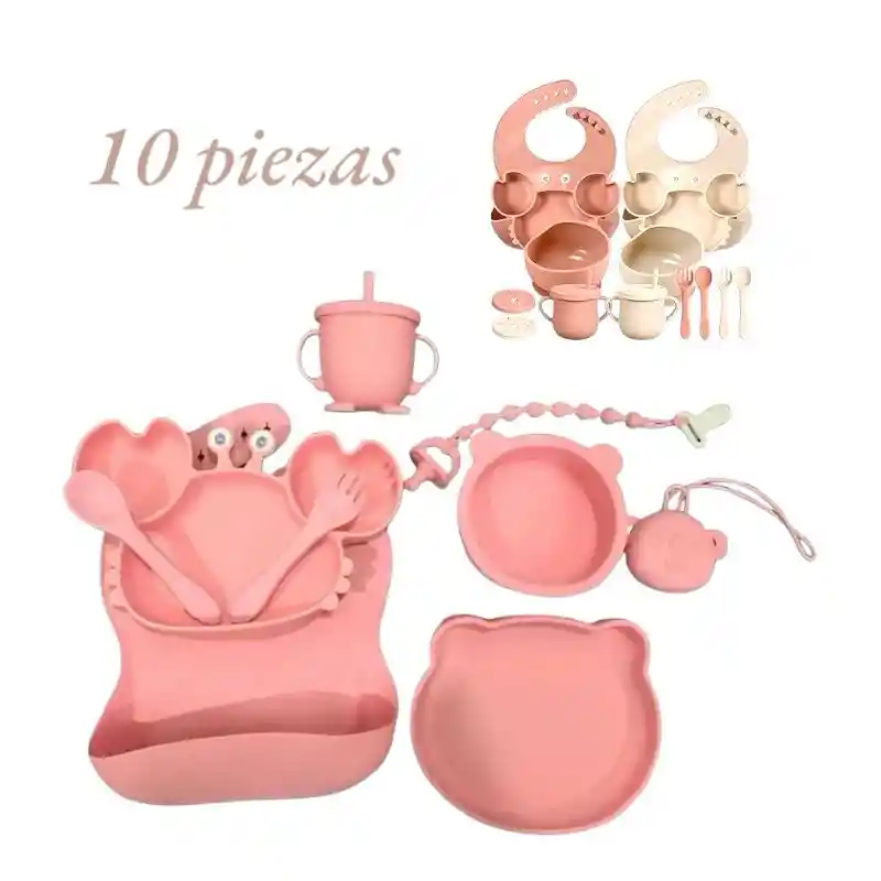 Características destacadas Este juego de vajilla para niños incluye todo lo que necesitas para alimentar a tu bebé de forma segura. DESCRIPCIÓN:Material seguro y fiable: los suministros de alimentación para bebé están hechos principalmente de silicona de calidad, que son seguras y fiables, fuertes y resistentes, suaves y cómodos, no se decoloran fácilmente, desgastan o rompen y sin bordes puntiagudos, por lo que no rayan la delicada piel del bebé.Se sujeta fácilmente: los baberos de silicona para bebé pueden atrapar alimentos durante la comida del bebé, manteniendo la ropa ordenada el babero de silicona es ajustable para que el bebé pueda obtener un tamaño adecuado ajustando el brocheFácil de limpiar: nuestras cucharas y tenedores de silicona, baberos y platos de silicona no absorben alimentos o agua y son fáciles de limpiar, puedes limpiarlos o enjuagarlos con agua o ponerlos en el lavavajillas para ahorrar tiempo y esfuerzo Hecho de silicona de calidad alimentaria. No tóxico, inodoro, insípido, reutilizable y ecológico. Resistente al calor, antideslizante, antiderrames y seguro. Ligero, portátil e irrompible, antiadherente, fácil de lavar. INCLUYE: 10 piezas