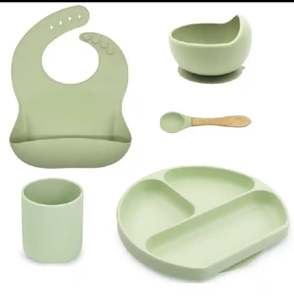 Cuchara de silicona con mango de madera, Tazón de succión de silicona para bebés, Baberos de silicona de grado alimenticio, plato con divisiones de silicona ahora de alta succión. Material Silicona Descripción 1. Babero de alta calidad se puede utilizar de 6 meses a 36 meses 2. Taza de silicona con succión moderada 3.Cuchara de silicona suave y flexible, ideal para sensibilidad de dientes y encías (mango de madera). 4. Plato en silicona, elaborado teniendo en cuenta las proporciones científicamente comprobados que deben consumir los niños (plato de alta succión) 5. Vaso en silicona sin succión 100% silicona