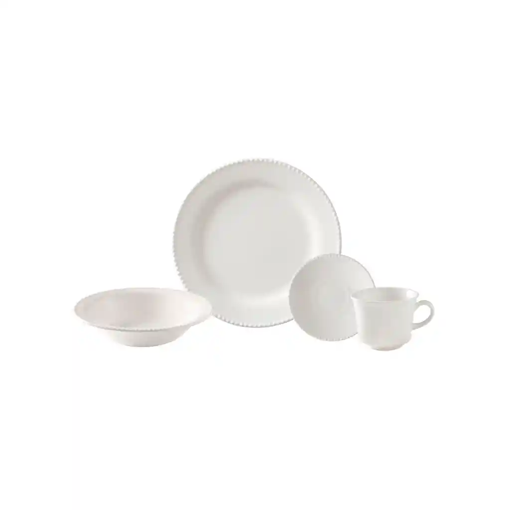 Juego de 16 piezas que incluye: 4 Platos Té 15cm, 4 Platos Pando 24cm, 4 Platos Hondo 20.5cm 4 Pocillos Té 240ml. Cada pieza cuenta con un delicado relieve de esferas en el borde que evoca la sofisticación de las perlas naturales. Fabricada por Corona, marca líder que garantiza estándares superiores de resistencia y acabados en cerámica. Elaborado en loza diseñada para resistir el uso diario manteniendo su brillo y color original por más tiempo. Las 4 tazas incluidas cuentan con un agarre cómodo y seguro, ideales para disfrutar de bebidas calientes. El diseño de las piezas permite un almacenamiento organizado en alacenas, optimizando el espacio en tu cocina. Su estética tradicional aporta un toque de distinción tanto en cenas formales como en almuerzos familiares. El esmalte de alta densidad evita la absorción de olores y sabores, garantizando la pureza de cada comida servida. Leves variaciones de color o esmalte son propias del proceso. No afectan la calidad, salud, funcionamiento ni durabilidad de la pieza.. Garantía de 12 meses por defectos de fábrica. No cubre otras averías. Cambios disponibles hasta 5 días tras la compra. Se entrega en un empaque protegido para asegurar que las piezas lleguen en perfectas condiciones hasta la puerta de tu hogar.. Estos productos han sido ambientados, los accesorios adicionales no están incluidos y su color puede variar por la luz.. . .