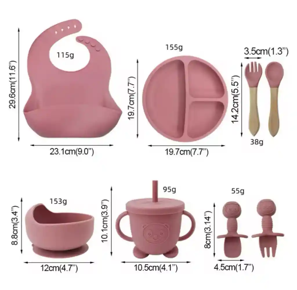 Juego de vajilla para bebe 8 piezas, ideal para acompañar la alimentación complementaria y promover la idependencia. Nuestro juego de alimentación se adapta a todas las etapas de la alimentación del bebe, desde purés hasta alimentos sólidos. Incluye: 1 Babero recogedor de alimentos 2 Mangos madera (cuchara y tenedor) 2 Mangos silicona (cuchara y tenedor) 1 Cuenco con ventosa de succión 1 Plato con ventosa 1 Vaso con pitillo Nuestro producto está hecho de silicona grado alimenticio, libre de BPA, sin ftalatos ni PVC. Es un producto totalmente seguro para los bebés. Su silicona de alta calidad la hace suave, e irompible, por lo que no necesitará reemplazo. Cada pieza es apta para lavavajillas, microondas y refrigerador. Contiene todo lo necesario para limentar con éxito a los bebes. Peso: 611 gr