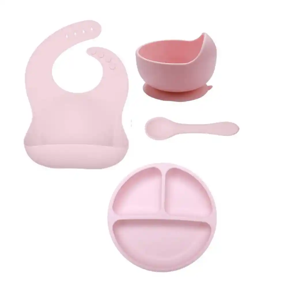 Detalles Material: Silicona de grado alimenticio Libre de BPA sin PVC, sin ftalatos +6 meses Contiene: 1 babero ajustable con bolsillo resistente, 1 plato plano con 3 divisiones, 1 plato hondo y 1 cuchara Placas de succión seguras y fáciles de limpiar para bebé.