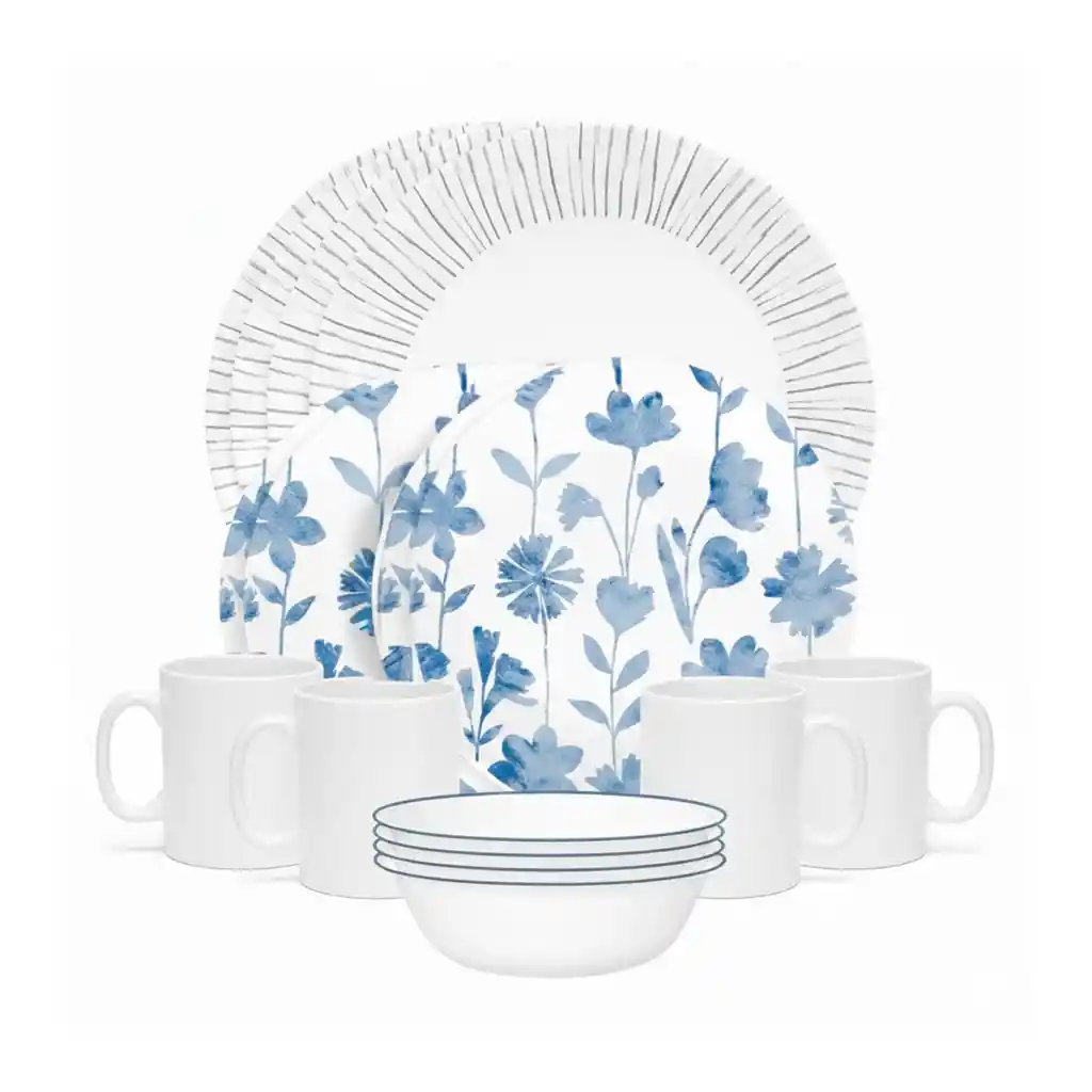 Juego de 16 piezas que incluye: 4 Platos de cena 10,25 cm, 4 Platos de aperitivos 6,75cm, 4 Tazones de sopa 6,25cm, 4 Pocillos 240ml . Set de 16 piezas con servicio para 4 personas, ideal para equipar su comedor con un estilo moderno y sofisticado. Platos y cuencos de vidrio de triple capa, únicos en su clase, resisten muy bien las astillas y las grietas, que garantiza máxima durabilidad.. Ultra resistente a golpes, desportilladuras y rayaduras, manteniendo su apariencia nueva por muchísimos años. Diseño Botanical Stripes con delicadas flores y líneas azules que evocan frescura y elegancia en tu mesa. Vajilla excepcionalmente ligera y delgada, facilitando su manejo y transporte de la cocina al comedor. Apta para horno microondas y horno convencional precalentado, ofreciendo una versatilidad superior. Compatible con lavavajillas, lo que permite una limpieza rápida y sin esfuerzo después de cada comida familiar. Material no poroso y 100% higiénico que no absorbe manchas, olores ni sabores, garantizando salud en su mesa. Resistente a la decoloración: los patrones y diseños no se borran ni se desgastan con el uso diario o los lavados. Ideal para el uso cotidiano intenso debido a su ligereza o para ocasiones especiales por su diseño distinguido. Se entrega en un empaque protegido para asegurar que las piezas lleguen en perfectas condiciones hasta la puerta de tu hogar. Estos productos han sido ambientados, los accesorios adicionales no están incluidos y su color puede variar por la luz. .