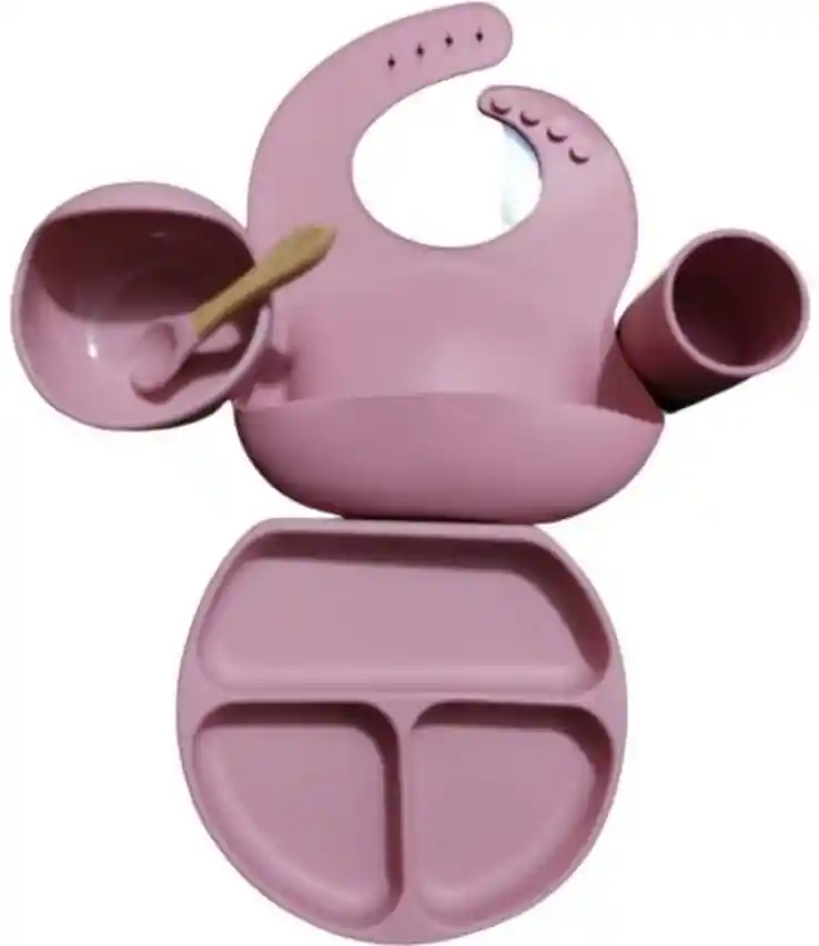 Cuchara de silicona con mango de madera, Tazón de succión de silicona para bebés, Baberos de silicona de grado alimenticio, plato con divisiones de silicona ahora de alta succión. Material Silicona Descripción 1. Babero de alta calidad se puede utilizar de 6 meses a 36 meses 2. Taza de silicona con succión moderada 3.Cuchara de silicona suave y flexible, ideal para sensibilidad de dientes y encías (mango de madera). 4. Plato en silicona, elaborado teniendo en cuenta las proporciones científicamente comprobados que deben consumir los niños (plato de alta succión) 5. Vaso en silicona sin succión 100% silicona