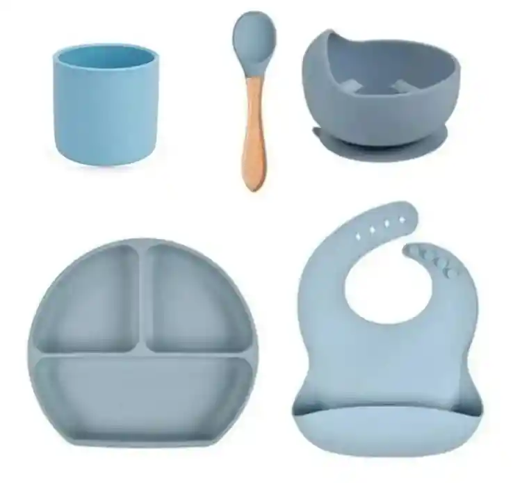 Cuchara de silicona con mango de madera, Tazón de succión de silicona para bebés, Baberos de silicona de grado alimenticio, plato con divisiones de silicona ahora de alta succión. Material Silicona Descripción 1. Babero de alta calidad se puede utilizar de 6 meses a 36 meses 2. Taza de silicona con succión moderada 3.Cuchara de silicona suave y flexible, ideal para sensibilidad de dientes y encías (mango de madera). 4. Plato en silicona, elaborado teniendo en cuenta las proporciones científicamente comprobados que deben consumir los niños (plato de alta succión) 5. Vaso en silicona sin succión 100% silicona