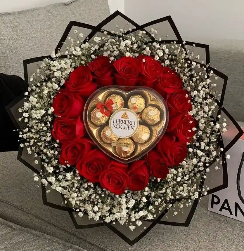 Ramo de rosas rojas con chocolates mas follaje y papel coreano