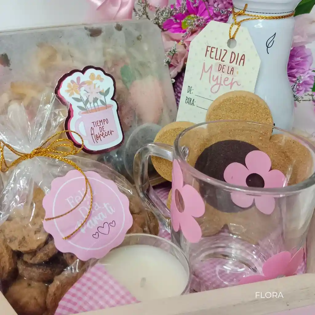 Caja hexagonal en madera con wafles x4 unidades + fresa, salsa y almendras, galletas chocochips, te Hatsu, mug flores, portavaso flor, vela aroma vainilla y mini bouquet (Flores variadas)