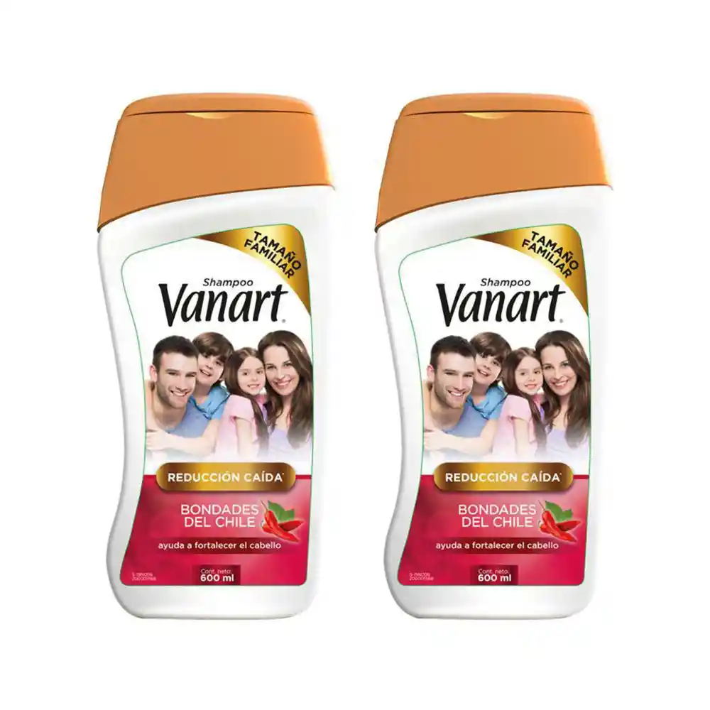 Vanart shampoo capilar reduccion caida con chile 600 ml x2. Hidrata y repara el cabello de toda la familia. Incluye extracto de chile verde que promueve el crecimiento de cabello. Aplicar shampoo reducción caída chile sobre el cabello mojado y enjuaga con abundante agua.