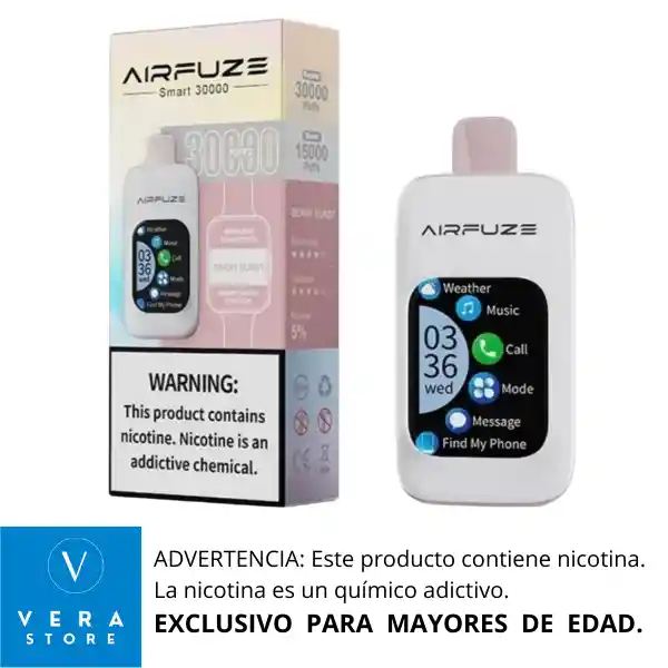 RECOMENDACIÓN IMPORTANTE: El vaporizador no llega con su batería cargada al 100% desde fabrica. Razón por la cual se debe colocar a cargar como mínimo 1 (una) hora de manera continua antes de usarlo, para lograr así un vapeo prolongado. El vap AirFuze Smart 30000 es un dispositivo de vapeo desechable que combina tecnología avanzada y conveniencia. Cuenta con una pantalla táctil de 2.01 pulgadas, conexión inalámbrica a dispositivos móviles y compatibilidad con smartphones y smartwatches.¹ Características clave: - Batería: 900mAh recargable - Capacidad: 20ml - Puffs: hasta 30,000 - Nicotina: 5% - Modos de operación: Boost (aproximadamente 15,000 puffs) y Regular (aproximadamente 30,000 puffs) El AirFuze Smart 30000 también ofrece funciones como reproducción de música, recepción de llamadas y más, gracias a su conexión Bluetooth.² RECOMENDACIONES *Mantener tu vape en un lugar seco, limpio y libre de agua. *Cargar la batería de tu vape para que funciones perfectamente.