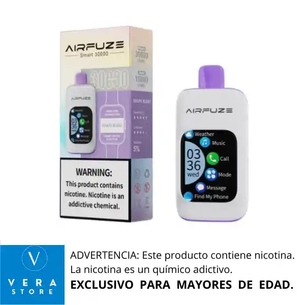 RECOMENDACIÓN IMPORTANTE: El vaporizador no llega con su batería cargada al 100% desde fabrica. Razón por la cual se debe colocar a cargar como mínimo 1 (una) hora de manera continua antes de usarlo, para lograr así un vapeo prolongado. El vap AirFuze Smart 30000 es un dispositivo de vapeo desechable que combina tecnología avanzada y conveniencia. Cuenta con una pantalla táctil de 2.01 pulgadas, conexión inalámbrica a dispositivos móviles y compatibilidad con smartphones y smartwatches.¹ Características clave: - Batería: 900mAh recargable - Capacidad: 20ml - Puffs: hasta 30,000 - Nicotina: 5% - Modos de operación: Boost (aproximadamente 15,000 puffs) y Regular (aproximadamente 30,000 puffs) El AirFuze Smart 30000 también ofrece funciones como reproducción de música, recepción de llamadas y más, gracias a su conexión Bluetooth.² RECOMENDACIONES *Mantener tu vape en un lugar seco, limpio y libre de agua. *Cargar la batería de tu vape para que funciones perfectamente.