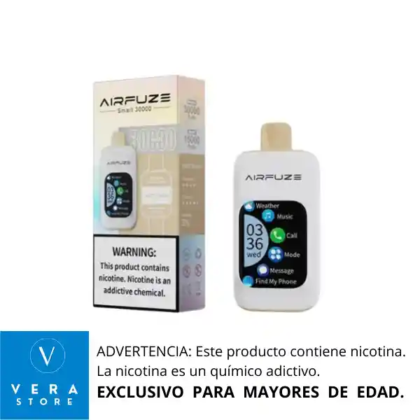 RECOMENDACIÓN IMPORTANTE: El vaporizador no llega con su batería cargada al 100% desde fabrica. Razón por la cual se debe colocar a cargar como mínimo 1 (una) hora de manera continua antes de usarlo, para lograr así un vapeo prolongado. El vap AirFuze Smart 30000 es un dispositivo de vapeo desechable que combina tecnología avanzada y conveniencia. Cuenta con una pantalla táctil de 2.01 pulgadas, conexión inalámbrica a dispositivos móviles y compatibilidad con smartphones y smartwatches.¹ Características clave: - Batería: 900mAh recargable - Capacidad: 20ml - Puffs: hasta 30,000 - Nicotina: 5% - Modos de operación: Boost (aproximadamente 15,000 puffs) y Regular (aproximadamente 30,000 puffs) El AirFuze Smart 30000 también ofrece funciones como reproducción de música, recepción de llamadas y más, gracias a su conexión Bluetooth.² RECOMENDACIONES *Mantener tu vape en un lugar seco, limpio y libre de agua. *Cargar la batería de tu vape para que funciones perfectamente.