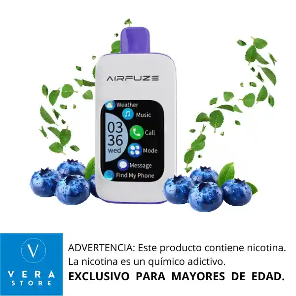 RECOMENDACIÓN IMPORTANTE: El vaporizador no llega con su batería cargada al 100% desde fabrica. Razón por la cual se debe colocar a cargar como mínimo 1 (una) hora de manera continua antes de usarlo, para lograr así un vapeo prolongado. El vap AirFuze Smart 30000 es un dispositivo de vapeo desechable que combina tecnología avanzada y conveniencia. Cuenta con una pantalla táctil de 2.01 pulgadas, conexión inalámbrica a dispositivos móviles y compatibilidad con smartphones y smartwatches.¹ Características clave: - Batería: 900mAh recargable - Capacidad: 20ml - Puffs: hasta 30,000 - Nicotina: 5% - Modos de operación: Boost (aproximadamente 15,000 puffs) y Regular (aproximadamente 30,000 puffs) El AirFuze Smart 30000 también ofrece funciones como reproducción de música, recepción de llamadas y más, gracias a su conexión Bluetooth. RECOMENDACIONES *Mantener tu vape en un lugar seco, limpio y libre de agua. *Cargar la batería de tu vape para que funciones perfectamente.