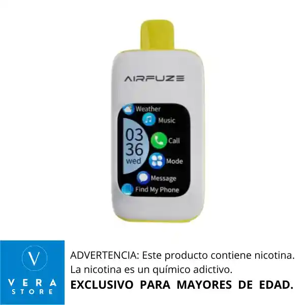 RECOMENDACIÓN IMPORTANTE: El vaporizador no llega con su batería cargada al 100% desde fabrica. Razón por la cual se debe colocar a cargar como mínimo 1 (una) hora de manera continua antes de usarlo, para lograr así un vapeo prolongado. El vap AirFuze Smart 30000 es un dispositivo de vapeo desechable que combina tecnología avanzada y conveniencia. Cuenta con una pantalla táctil de 2.01 pulgadas, conexión inalámbrica a dispositivos móviles y compatibilidad con smartphones y smartwatches.¹ Características clave: - Batería: 900mAh recargable - Capacidad: 20ml - Puffs: hasta 30,000 - Nicotina: 5% - Modos de operación: Boost (aproximadamente 15,000 puffs) y Regular (aproximadamente 30,000 puffs) El AirFuze Smart 30000 también ofrece funciones como reproducción de música, recepción de llamadas y más, gracias a su conexión Bluetooth.² RECOMENDACIONES *Mantener tu vape en un lugar seco, limpio y libre de agua. *Cargar la batería de tu vape para que funciones perfectamente.