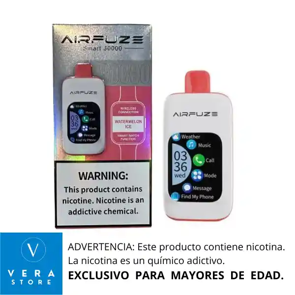 RECOMENDACIÓN IMPORTANTE: El vaporizador no llega con su batería cargada al 100% desde fabrica. Razón por la cual se debe colocar a cargar como mínimo 1 (una) hora de manera continua antes de usarlo, para lograr así un vapeo prolongado. El vap AirFuze Smart 30000 es un dispositivo de vapeo desechable que combina tecnología avanzada y conveniencia. Cuenta con una pantalla táctil de 2.01 pulgadas, conexión inalámbrica a dispositivos móviles y compatibilidad con smartphones y smartwatches.¹ Características clave: - Batería: 900mAh recargable - Capacidad: 20ml - Puffs: hasta 30,000 - Nicotina: 5% - Modos de operación: Boost (aproximadamente 15,000 puffs) y Regular (aproximadamente 30,000 puffs) El AirFuze Smart 30000 también ofrece funciones como reproducción de música, recepción de llamadas y más, gracias a su conexión Bluetooth.² RECOMENDACIONES *Mantener tu vape en un lugar seco, limpio y libre de agua. *Cargar la batería de tu vape para que funciones perfectamente.