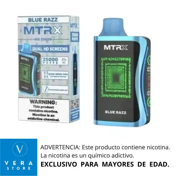RECOMENDACIÓN IMPORTANTE: El vaporizador no llega con su batería cargada al 100% desde fabrica. Razón por la cual se debe colocar a cargar como mínimo 1 (una) hora de manera continua antes de usarlo, para lograr así un vapeo prolongado. El vape MRTX 25000 puffs parece ser un dispositivo de vapeo desechable con una gran cantidad de puffs. Aquí te presento algunas características que podrían ser relevantes: 1. Duración de la batería: La batería debería durar para los 25000 puffs, dependiendo del uso y la configuración del dispositivo. 2. Capacidad del tanque: El tanque debería tener una capacidad suficiente para contener el líquido de vapeo necesario para los 25000 puffs. 3. Sabor y nicotina: El dispositivo podría ofrecer diferentes sabores y niveles de nicotina para satisfacer las preferencias de los usuarios. 4. Diseño y tamaño: El dispositivo podría ser compacto y ligero, lo que lo hace fácil de llevar y usar. 5. Seguridad: El dispositivo debería tener características de seguridad integradas, como protección contra sobrecarga y cortocircuitos. Ventajas 1. Conveniencia: Un dispositivo desechable con 25000 puffs ofrece una gran conveniencia, ya que no requiere recargar o rellenar el tanque. 2. Larga duración: La gran cantidad de puffs asegura que el dispositivo dure mucho tiempo, lo que reduce la necesidad de reemplazarlo con frecuencia. * Calidad del dispositivo: La calidad del dispositivo y del líquido de vapeo puede variar dependiendo del fabricante y del proveedor. Aquí te presento una guía general para usar el vape MRTX 25000 puffs: Paso 1: Encender el dispositivo 1. Verifica que el dispositivo esté cargado: Asegúrate de que el dispositivo tenga suficiente carga para funcionar. 2. Presiona el botón de encendido: Por lo general, hay un botón en el dispositivo que debes presionar para encenderlo. Paso 2: Ajustar la configuración 1. Verifica si hay ajustes: Algunos dispositivos tienen ajustes para la potencia o el flujo de aire. Asegúrate de entender cómo funcionan estos ajustes. 2. Ajusta según tus preferencias: Si el dispositivo tiene ajustes, puedes ajustarlos según tus preferencias personales. Paso 3: Vapear 1. Toma una bocanada: Coloca tus labios en la boquilla y toma una bocanada suave y lenta. 2. Activa el dispositivo: Al tomar una bocanada, el dispositivo debería activarse y producir vapor. 3. Inhala y exhala: Inhala el vapor y exhala lentamente. Paso 4: Cuidar el dispositivo 1. Evita sobrecargar el dispositivo: No uses el dispositivo de manera excesiva, ya que esto puede reducir su vida útil. 2. Almacena el dispositivo adecuadamente: Cuando no estés usando el dispositivo, almacénalo en un lugar fresco y seco. Consejos adicionales 1. Lee las instrucciones del fabricante: Asegúrate de leer las instrucciones del fabricante para entender cómo usar el dispositivo de manera segura y efectiva. 2. Usa el dispositivo de manera responsable: Recuerda que el vapeo puede tener riesgos para la salud, así que usa el dispositivo de manera responsable y moderada.