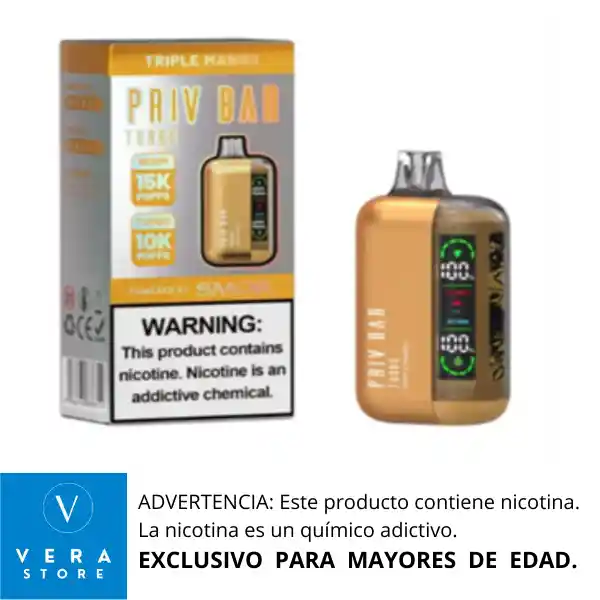 RECOMENDACIÓN IMPORTANTE: El vaporizador no llega con su batería cargada al 100% desde fabrica. Razón por la cual se debe colocar a cargar como mínimo 1 (una) hora de manera continua antes de usarlo, para lograr así un vapeo prolongado. Vaporizador desechable es un dispositivo extraordinario equipado con 16 ml de e-liquid precargado y una batería recargable. Está equipado con una pantalla de visualización que muestra tanto el estado de la batería como el nivel de e-juice. Diseñado para ofrecer aproximadamente 15,000 inhalaciones, Priv Bar Turbo promete una experiencia de vapeo extensa. Aprovecha la tecnología avanzada de SMOK, lo que garantiza una producción de vapor denso y una entrega satisfactoria de nicotina. La comodidad adicional de la pantalla permite a los usuarios monitorear sin esfuerzo tanto los niveles de batería como de e-liquid, mejorando la experiencia general de vapeo. * Modo normal de 15000 bocanadas * Modo 10000 Turbo * 16 ml de capacidad de líquido electrónico * 5% (50 mg) de concentración de nicotina * Hasta 15000 inhalaciones * Batería y E-líquido indican * Batería Recargable * Puerto tipo C (cable no incluido) * 800 mAh Capacidad de la batería