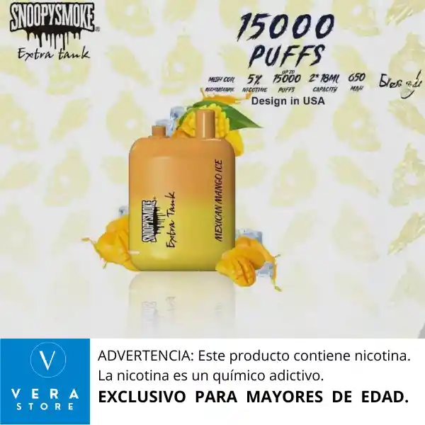 RECOMENDACIÓN IMPORTANTE: El vaporizador no llega con su batería cargada al 100% desde fabrica. Razón por la cual se debe colocar a cargar como mínimo 1 (una) hora de manera continua antes de usarlo, para lograr así un vapeo prolongado. El vaporizador SnoopySmoke de 15.000 puffs es un dispositivo desechable que ofrece una experiencia de vapeo prolongada y satisfactoria. A continuación, te presento algunas características y beneficios clave: - Capacidad y rendimiento: - Hasta 15.000 puffs por dispositivo, lo que garantiza una experiencia prolongada y sin interrupciones - Contiene una cantidad considerable de e-líquido con una variedad de sabores y niveles de nicotina - Diseño y batería: - Batería integrada de alta capacidad para soportar la larga duración del dispositivo - Diseño ergonómico y portátil para facilitar su uso en cualquier momento - Ventajas: - Larga duración y gran cantidad de puffs por dispositivo - No requiere recarga, lo que lo hace ideal para uso en movimiento - Amplia variedad de sabores y opciones para elegir - Colaboración: - La marca SnoopySmoke sugiere una posible colaboración con el famoso rapero Snoop Dogg, lo que podría aportar experiencia y calidad al producto - Consideraciones: - Es importante seguir las instrucciones de uso y mantenimiento para garantizar la seguridad y longevidad del dispositivo En general, el vaporizador SnoopySmoke de 15.000 puffs parece ser una excelente opción para aquellos que buscan una experiencia de vapeo prolongada y satisfactoria.