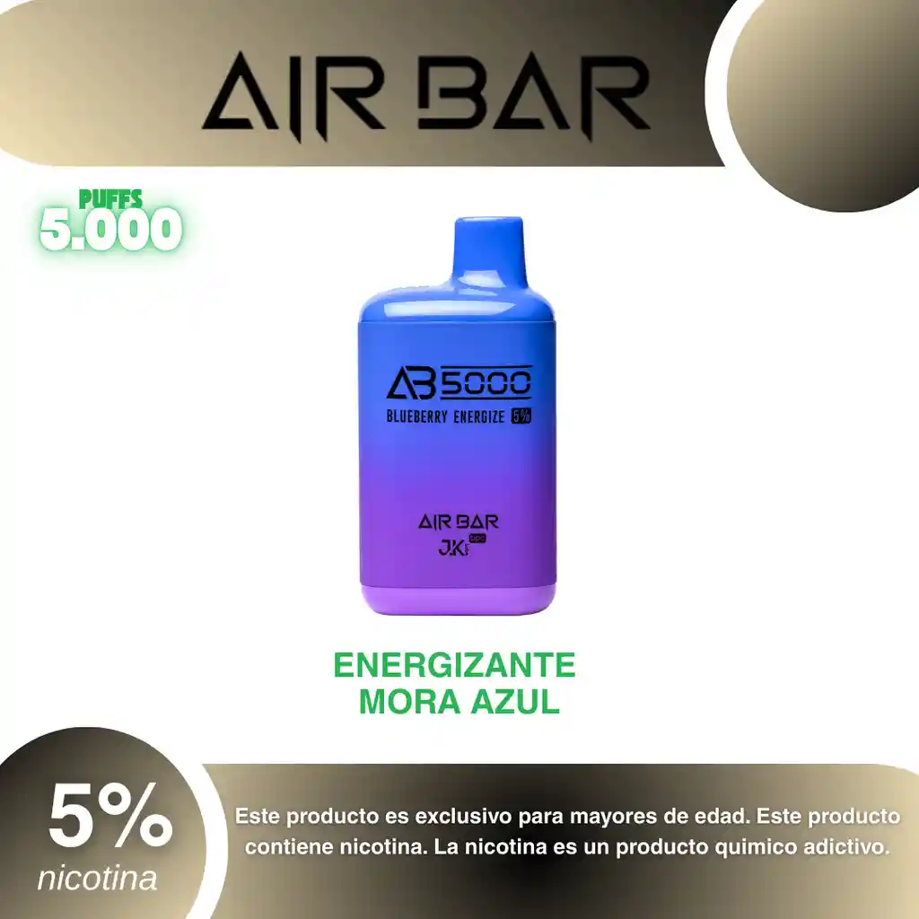 Air Bar Ab 5.000 Puffs, Sabor Energizante de Blueberry 5% PROHIBIDA LA VENTA A MENORES DE EDAD. ADVERTENCIA: ESTE PRODUCTO CONTIENE NICOTINA, LA NICOTINA ES UNA SUSTANCIA QUIMICA ADICTIVA Y NOCIVA PARA LA SALUD. Los líquidos para vapeo contienen: propilenglicol USP, glicerina USP, sabor artificial y nicotina. Este producto puede contener nicotina, una sustancia altamente adictiva que puede generar dependencia, posibles afectaciones arteriales, cardiacas, pulmonares y otras aun no identificadas. No se recomienda su uso a mujeres en embarazo, puede generar lesiones al feto. Mantener alejado de niños y mascotas. No ingerir, puede generar irritación y/o intoxicación. Por favor antes de consumir consulte a su médico posibles afectaciones o sensibilidad a alguno de sus componentes. Los componentes de este producto pueden aumentar la sensación de ansiedad En caso de notar alguna reacción adversa por favor suspenda su uso de manera inmediata. Siga las instrucciones en el envase. No alterar sus componentes. Adquiera sus productos en sitios de confianza No use productos piratas, alterados, o en los cuales no pueda comprobar su buena procedencia, Verifique la reputación del fabricante y distribuidor antes de adquirir cualquier producto Si no es usuario fumador o vapeador no se recomienda su uso bajo ninguna circunstancia Al usar este producto usted es consciente que este producto puede generar afectaciones a su salud, incluyendo aquellas que a la fecha de la compra no se han identificado y que pueden aparecer a largo plazo.