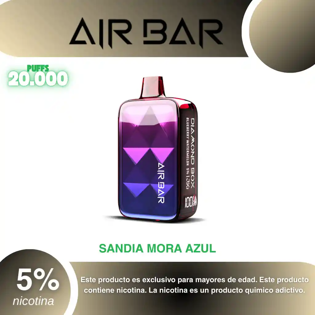 Air Bar Diamond Box 20.000 Puffs, Sabor Mora Azul y Sandia. PROHIBIDA LA VENTA A MENORES DE EDAD. ADVERTENCIA: ESTE PRODUCTO CONTIENE NICOTINA, LA NICOTINA ES UNA SUSTANCIA QUIMICA ADICTIVA Y NOCIVA PARA LA SALUD. Los líquidos para vapeo contienen: propilenglicol USP, glicerina USP, sabor artificial y nicotina. Este producto puede contener nicotina, una sustancia altamente adictiva que puede generar dependencia, posibles afectaciones arteriales, cardiacas, pulmonares y otras aun no identificadas. No se recomienda su uso a mujeres en embarazo, puede generar lesiones al feto. Mantener alejado de niños y mascotas. No ingerir, puede generar irritación y/o intoxicación. Por favor antes de consumir consulte a su médico posibles afectaciones o sensibilidad a alguno de sus componentes. Los componentes de este producto pueden aumentar la sensación de ansiedad En caso de notar alguna reacción adversa por favor suspenda su uso de manera inmediata. Siga las instrucciones en el envase. No alterar sus componentes. Adquiera sus productos en sitios de confianza No use productos piratas, alterados, o en los cuales no pueda comprobar su buena procedencia, Verifique la reputación del fabricante y distribuidor antes de adquirir cualquier producto Si no es usuario fumador o vapeador no se recomienda su uso bajo ninguna circunstancia Al usar este producto usted es consciente que este producto puede generar afectaciones a su salud, incluyendo aquellas que a la fecha de la compra no se han identificado y que pueden aparecer a largo plazo.