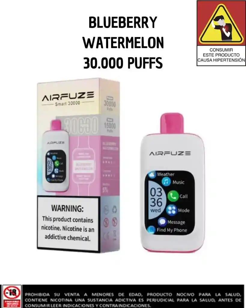 ⚡ Airfuze Smart Vape 30K – Tecnología y Sabor en un Solo Dispositivo ⚡ Vapea como nunca con el Airfuze Smart 30K, el desechable inteligente de 30,000 caladas que combina potencia, conectividad y sabores premium. 🚀 Lo que lo hace único: 🔥Pantalla táctil TFT de 2.01”: Control total de tu experiencia con un solo toque. 🔥Conexión Bluetooth: Escucha música, responde llamadas, toma fotos y más, directamente desde tu vape. 🔥Modos de potencia ajustables: Elige entre Suave (12W), Normal (18W) o Boost (25W) para un vapeo a tu medida. 🔥Sabores frutales intensos: Mezclas dulces y refrescantes para cada gusto. 🔥Autonomía increíble: Hasta 30,000 puffs en modo regular o 15,000 en modo Boost.