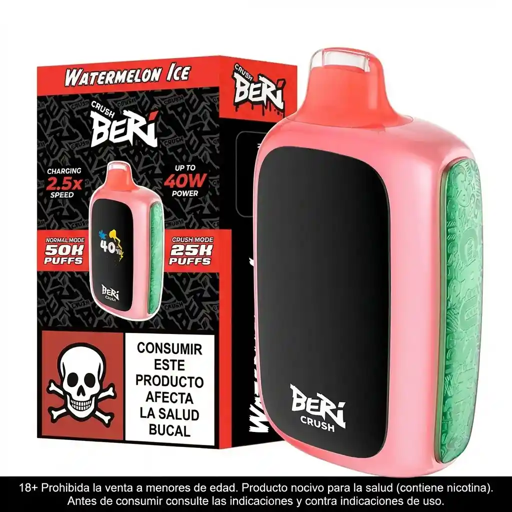 Beri Crush es un dispositivo de vapeo desechable. 5% nicotina. Incluye una función de ajuste automático de 6 modos y un modo de potencia de 40W, lo que lo convierte en el primer dispositivo de su tipo en el mundo. Cuenta con una batería integrada de 1000mAh, capacidad de carga rápida de 2.5A, flujo de aire ajustable y una pantalla TFT de 1.77 pulgadas. Un sistema de retroalimentación de datos preciso y un movimiento dinámico mejoran la experiencia del usuario.
