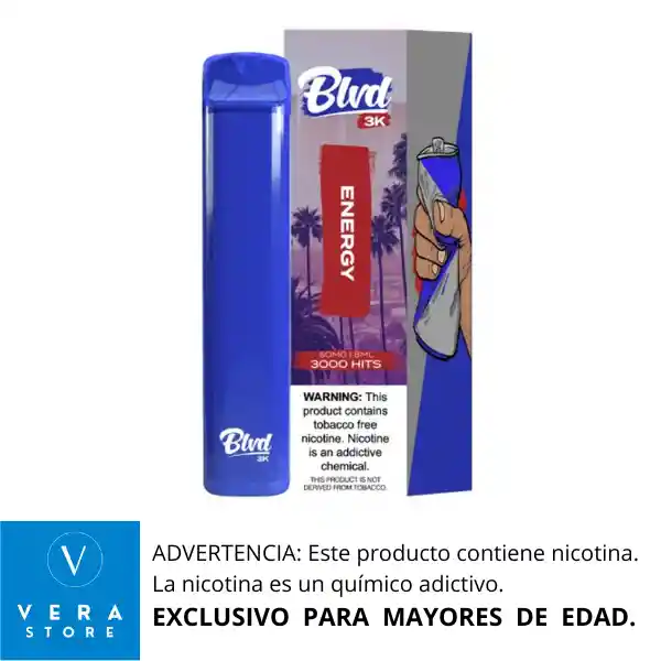 RECOMENDACIÓN IMPORTANTE: El vaporizador no llega con su batería cargada al 100% desde fabrica. Razón por la cual se debe colocar a cargar como mínimo 1 (una) hora de manera continua antes de usarlo, para lograr así un vapeo prolongado. El vaporizador BLVD 3K es un dispositivo desechable que ofrece hasta 3,000 puffs, con una batería de 1100mAh y 8ml de líquido. Contiene nicotina al 5% (50mg) y viene en varios sabores. - Características: - Batería recargable - 8ml de líquido - Hasta 3,000 puffs - Nicotina al 5% (50mg) Es importante tener en cuenta que los vapes pueden contener sustancias adictivas y no son recomendados para menores de edad ni para personas que no fuman.