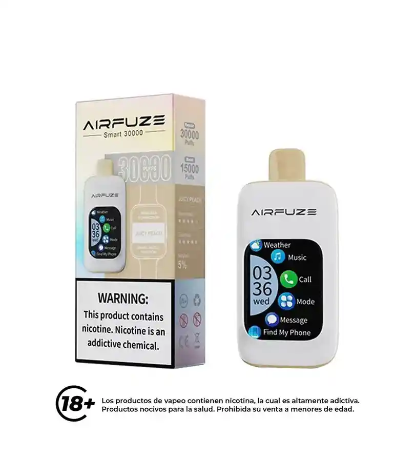 - Airfuze Smart 30000 es un vape desechable de alta gama Con una pantalla táctil y conexión Bluetooth, permite elegir entre 3 niveles de potencia para un vapeo a medida. Recargable por USB-C, ofrece funciones conectadas como reproductor de música o hacer llamadas.